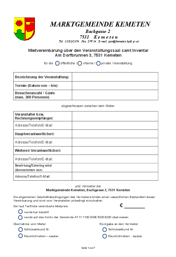 Anfragen zur Anmietung der Räumlichkeiten sind direkt beim Gemeindeamt Kemeten, entweder telefonisch während der Amtsstunden unter 03352/5374, oder per Email: post@kemeten.bgld.gv.at zu stellen.